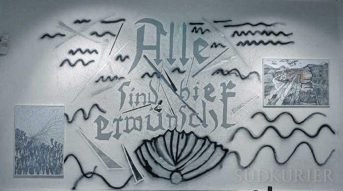 „Alle sind hier erwünscht“, steht im Treppenaufgang an die Wand geschrieben – aber im eisigem Silber säbelrasselnder Stahlgewitter und in jener Schriftype, mit der im Dritten Reich Schilder mit der Aufschrift „Juden sind hier unerwünscht“ gepinselt wurden. Spottet also die martialische Schrift der freundlichen Botschaft, oder „entschuldet“ umgekehrt die Botschaft die diskreditierte Schrifttype? Wellenlinien und eine Muschel deuten darauf hin, dass die ehrlich oder zynisch willkommen Geheißenen nicht Juden sind, sondern übers Meer gekommene Flüchtlinge. Die Menschenmassen bleiben hier unsichtbar – auf einer riesigen Zeichnung Jaworskas im Format eines gerollten Banners sind sie hingegen sichtbar: Unzählige anonyme Menschen, die hinter einer Vergitterung aus grau-schwarzer Sprühfarbe stehen.