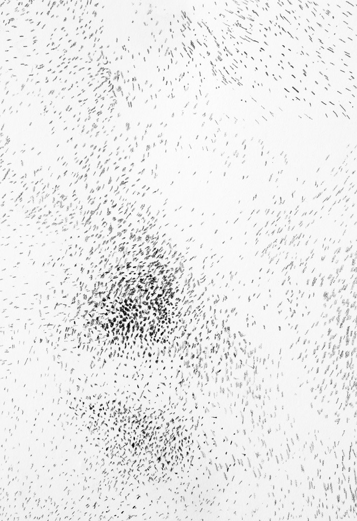 Bei Farbe aus der Spraydose denkt man an verbotene Parolen und an Protest, angesichts des Banner-Formats des Blattes an eine Demonstration. Wofür oder wogegen richtet sie sich –und sind diese Menschen nun Demonstranten? Nur eines stellt die Künstlerin klar: Sie entfernen sich vom Betrachter. Ihr Exodus führt über die Hügel ins Irgendwo. Zeigen weitere Zeichnungen Jaworskas eine zerfallene Weltordnung? Wie zerschnittene und neu verklebte Längen- und Breitengrade wirken die netzartigen Linien mit ihren graphitgrauen Abschnitten, die zerteilte Landmassen sein könnten. Oder bildet man sich das alles nur ein? Weitere Zeichnungen sind nur noch ein Hagel von Gestrichel. Die Landschaft oder die Figur, zu der sie sich ordnen mögen, befinden sich wie bei einem Rorschachtest nur im Auge des Betrachters. Eine Antwort, die außerhalb seiner eigenen Ahnung läge, bekommt er nicht. So gehen Renata Jaworskas Zeichnungen in die Zone des Resonanzlosen. Eine Zone, die dem Statement, als das man ihre Wandschrift leicht fehlinterpretieren könnte, entgegengesetzt ist.
